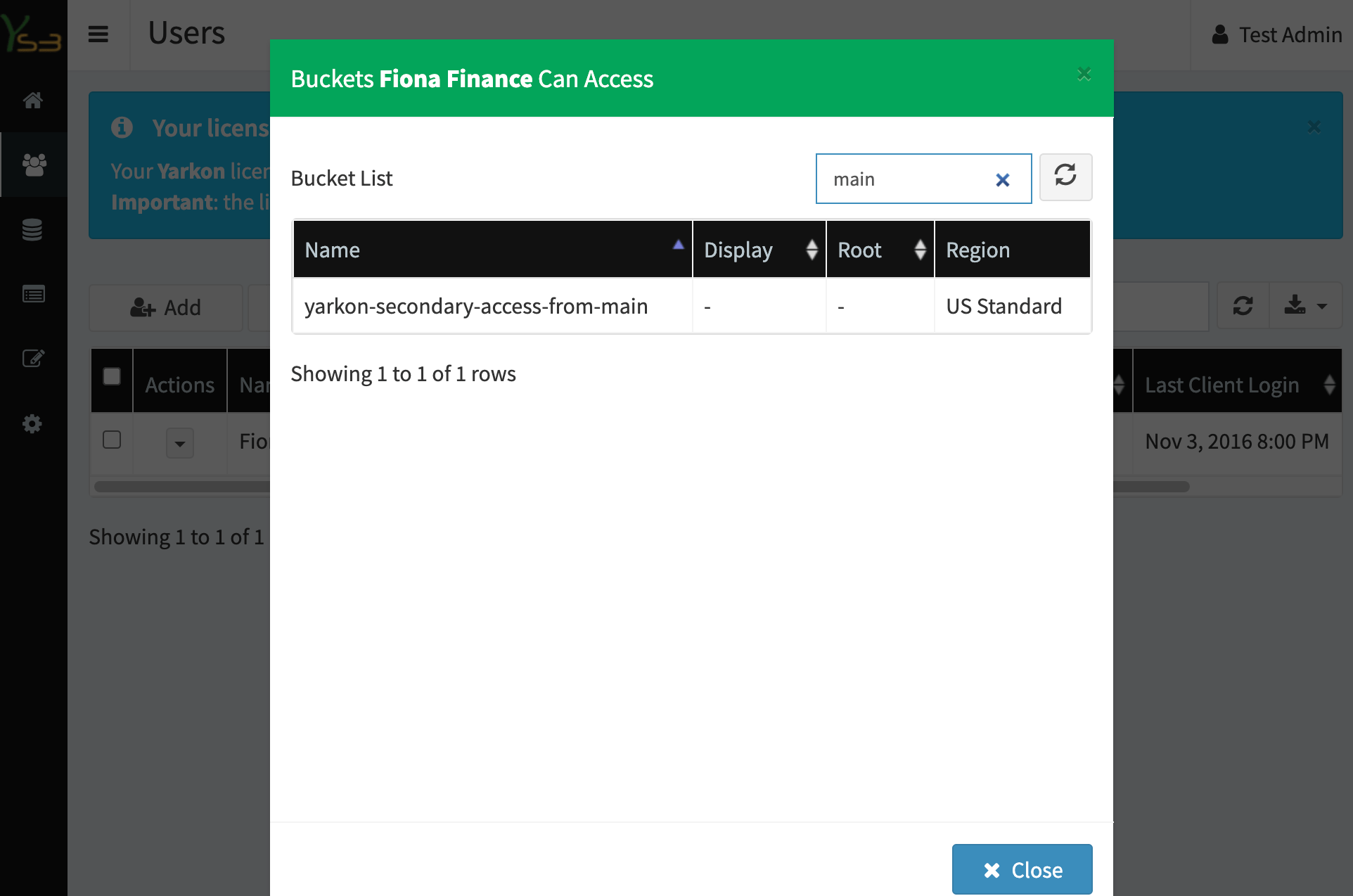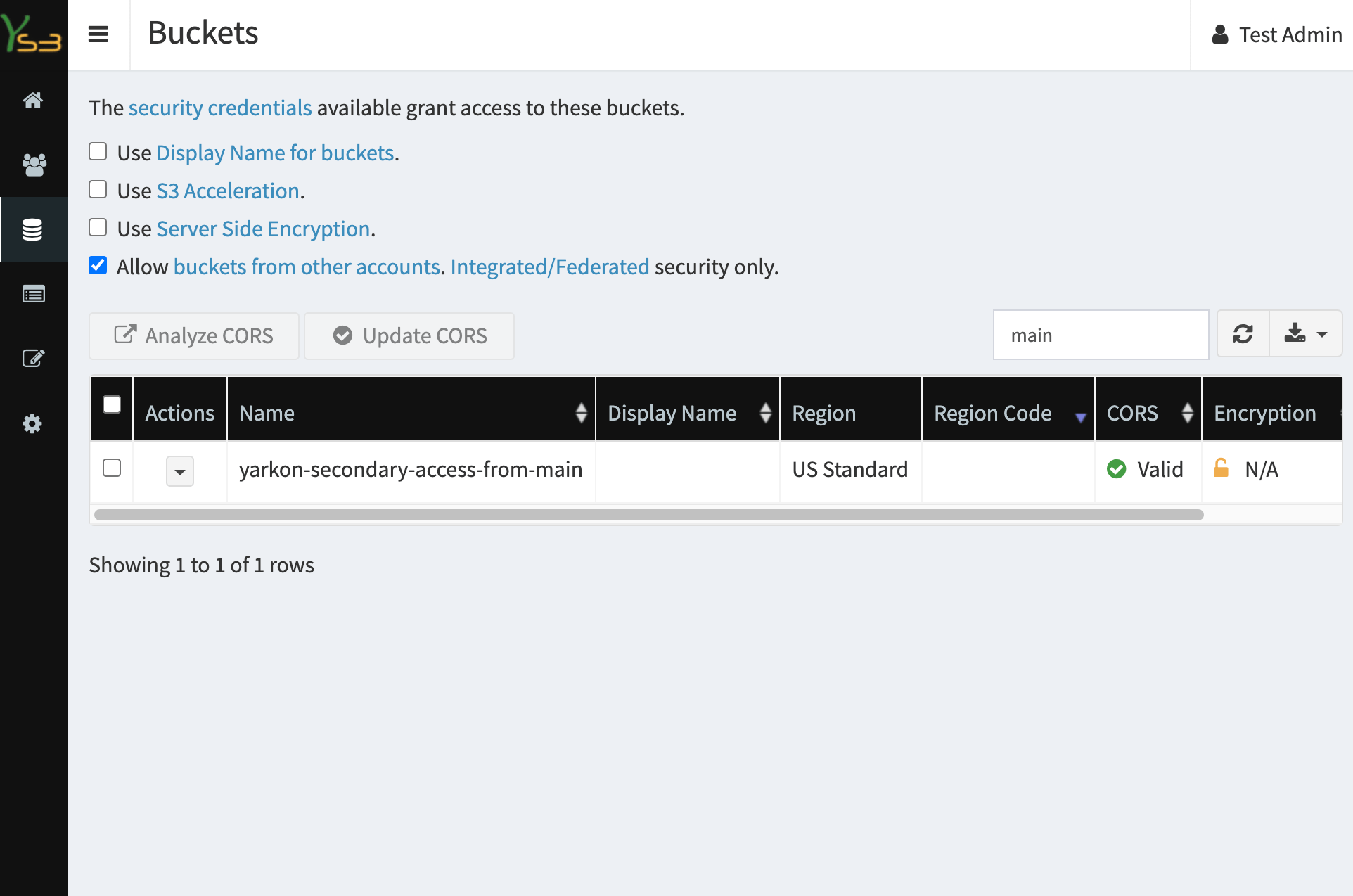 yarkon-main-provide-access-to-secondary-bucketto the role. - Go to the Yarkon Admin Console, Buckets page, and refresh the list. You should now be able to see the bucket from the secondary account listed.
