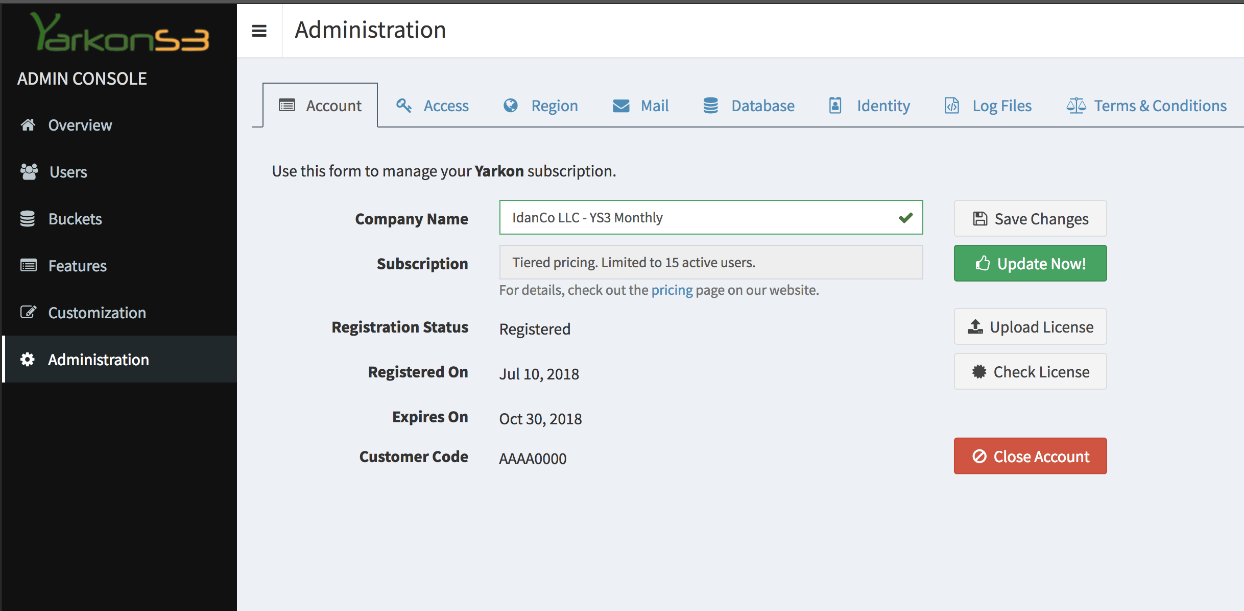 If you have an existing license that you would like to update - maybe you want to make a change to the number of users you have - open the Administrator Console, then choose the Account tab under the Administration section. Click the Update Now button to start the process.