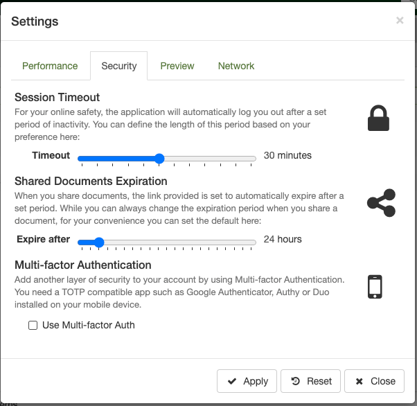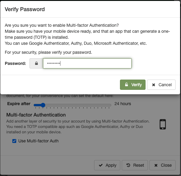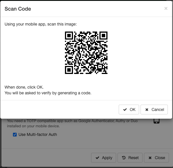 Users can access the MFA option from the Settings form, under the security tab. After going through a password verification, the user would be presented with a Q-code (see image below), to be scanned by a mobile device equipped by any TOTP compatible app, like Google Authenticator etc. To complete the set up, the user must successfully enter a code generated by the mobile app.